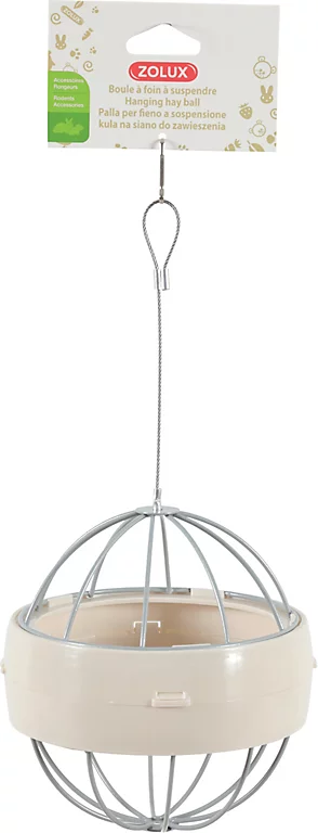 Boule à foin en plastique et métal à suspendre à la cage. Cette boule à foin permet de garder un foin propre et sec, protégé des salissures présentes au sol. Disponible en 2 coloris : beige et gris.