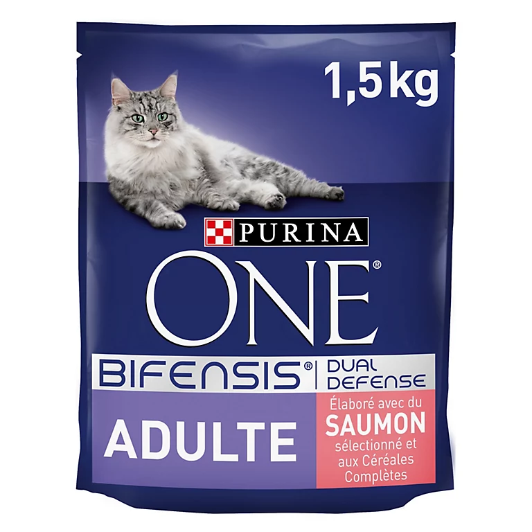 PURINA ONE Adulte est spécialement formulé pour les chats âgés de plus de 1 an. PURINA ONE BIFENSIS® est une formule unique, contenant des bactéries fonctionnelles bénéfiques, scientifiquement prouvée pour aider à renforcer les défenses naturelles de votre chat. Développée par les vétérinaires et les nutritionnistes PURINA, PURINA ONE BIFENSIS® contient, en plus des bactéries fonctionnelles bénéfiques, tous les nutriments essentiels dont votre chat a besoin, tels que des acides gras Oméga 6. Cette formule double défense contribue à la fois, à l’intérieur, à soutenir la production naturelle d’anticorps de votre chat et, à l’extérieur, à maintenir sa peau saine et son pelage brillant. Disponible dans une large gamme de recettes d’une grande saveur et élaboré avec des ingrédients de haute qualité, dont du saumon comme ingrédient N°1, PURINA ONE BIFENSIS® aide à soutenir les défenses naturelles de votre chat aujourd’hui et demain. Sans colorants, ni arômes et conservateurs artificiels ajoutés.