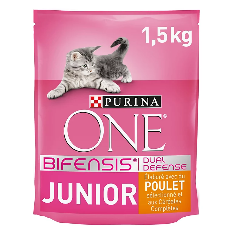 PURINA ONE Junior est spécialement formulé pour répondre aux besoins nutritionnels des chatons (du sevrage jusqu’à 12 mois) et pour les chattes en gestation ou en lactation. PURINA ONE BIFENSIS® est une formule unique, contenant des bactéries fonctionnelles bénéfiques, scientifiquement prouvée pour aider à renforcer les défenses naturelles de votre chat. Développée par les vétérinaires et les nutritionnistes PURINA, PURINA ONE BIFENSIS® contient, en plus des bactéries fonctionnelles bénéfiques, tous les nutriments essentiels dont votre chat a besoin, tels que des acides gras Oméga 6. Cette formule double défense contribue à la fois, à l’intérieur, à soutenir la production naturelle d’anticorps de votre chat et, à l’extérieur, à maintenir sa peau saine et son pelage brillant. Disponible dans une large gamme de recettes d’une grande saveur et élaboré avec des ingrédients de haute qualité, dont du saumon comme ingrédient N°1, PURINA ONE BIFENSIS® aide à soutenir les défenses naturelles de votre chat aujourd’hui et demain. Sans colorants, ni arômes et conservateurs artificiels ajoutés.
