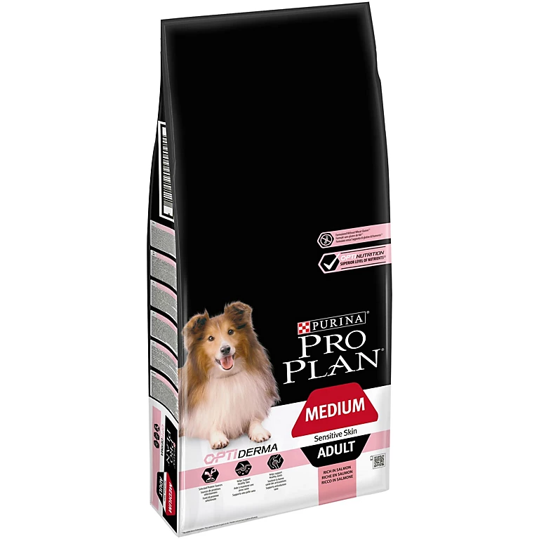 PURINA PRO PLAN Medium Adult Sensitive Skin avec OPTIDERMA™ est une recette de croquettes pour Chiens adultes ayant une peau sensible. Si votre Chiens de taille moyenne a une peau sensible, cet aliment est spécialement formulé pour répondre à ses besoins et cibler cette sensibilité. OPTIDERMA™ est une combinaison de nutriments qui ciblent la peau, et aide à soutenir la bonne santé du poil. Il contient également des sources sélectionnées de protéines qui aident à réduire un possible inconfort cutané dû à une intolérance alimentaire. Cette alimentation complète est riche en saumon et contient tous les nutriments essentiels dont votre Chiens a besoin pour un mode de vie sain et actif. Elle soutient également la bonne santé des articulations. Aidez-le à dépasser les obstacles quotidiens et les troubles liés à une peau sensible grâce aux croquettes PURINA PRO PLAN Medium Adult avec OPTIDERMA™.