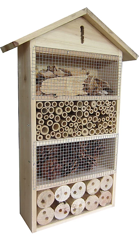 Hôtel pour insectes auxiliaires en pin certifié FSC®. L’hôtel à insectes permet d’abriter bon nombre d’auxiliaires du jardin et de favoriser ainsi la pollinisation des plantes et la lutte biologique contre les insectes ravageurs (pucerons, chenilles…). Sans pollinisateurs la reproduction de nombreuses plantes ne pourrait se faire naturellement et provoquerait leur disparition.