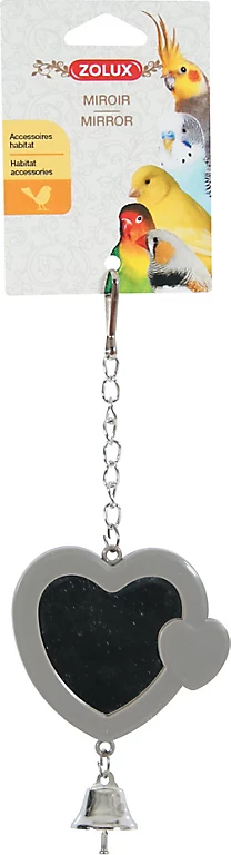 Jouet à suspendre miroir en forme de coeur avec clochette. Non toxique : peinture conforme aux normes alimentaires (Norme EN71-3). Coloris tendances : vert olive, taupe et beige, en adéquation avec les cages et volières arabesque.
