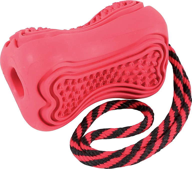 Jouet ultra-résistant fabriqué à partir de caoutchouc naturel. Sa forme spécifique permet de l’utiliser comme distributeur de friandises pour des heures de divertissement. Les rainures et les picots également présents sur le jouet favorisent l’hygiène dentaire. La corde présente sur le jouet permet de l’attraper facilement et d’interagir avec votre chien en le laissant tirer. Idéal pour les jeux de lancer/rapporter. Taille : large. Coloris : rouge.