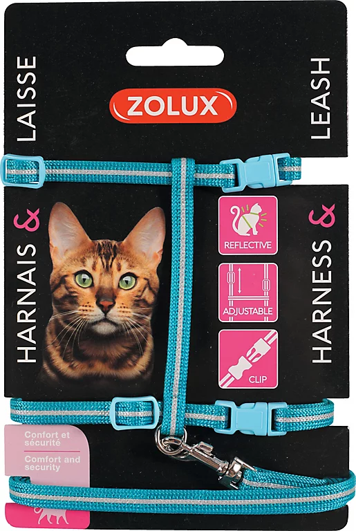 Kit sellerie pour chat composé d’une laisse de 1m20 et d’un harnais réglable. Sangle en nylon réfléchissante pour une meilleure visibilité. Harnais équipé de boucles clips en plastique : mise en place facile et maintien optimal. Mousqueton et « dé » d’attache en métal pour plus de sécurité. Taille harnais mini/maxi du cou : 18cm à 27cm. Taille harnais mini/maxi du poitrail : 25cm à 40cm. Coloris : bleu.
