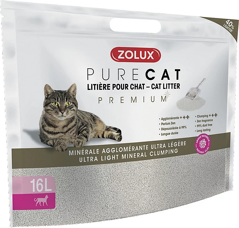 Litière minérale agglomérante ultra légère Premium aux propriétés exceptionnelles, fabriquée à base d’argile naturelle. Son haut pouvoir agglomérant prolonge sa durée d’utilisation et réduit sa consommation : le sac de 16L permet jusqu’à 90 jours d’utilisation (cette durée dépend du poids du chat, de sa race, de son âge, de son type d’alimentation, du lieu de stockage du bac à litière ….). Son poids plus léger d’environ 40% que les litières bentonites agglomérantes traditionnelles la rend plus facile à porter. Au contact de l’urine, les grains libèrent un agréable parfum Zen. Hygiénique, cette litière est dépoussiérée à 99%. Elle convient à tous les chats, même les plus sensibles et leur offre un grand confort d’utilisation. Son taux d’absorption est de 300%.