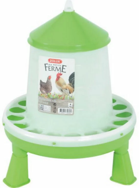 Mangeoire silo en plastique sur pieds pour limiter les salissures. Facile à remplir. Capacité : 4 Kg.