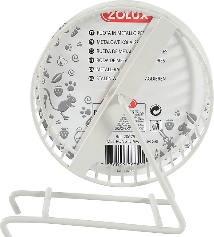 Roue d’exercice en métal pour petits mammifères. Disponible en 2 coloris : beige et gris. Disponible en 3 diamètres de roue : 11cm, 14 cm et 18 cm.