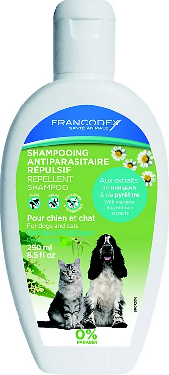 | Mode d'emploi | Agiter avant emploi. Appliquer une petite quantité de shampooing sur l’animal préalablement mouillé et masser pour bien répartir le produit. Laisser agir quelques minutes, puis rincer abondamment. |