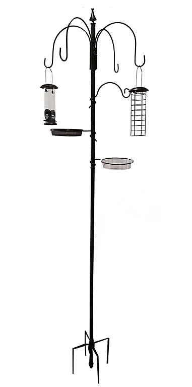 | Inclus | La station est composée d'un poteau en métal avec 5 crochets de suspension, un pied stabilisateur et plusieurs accessoires dont : – 1 coupelle grille en métal et 1 coupelle en plexiglas+ supports de fixation – 1 mangeoire pour mélange de graines – 1 silo pour boules de graisse |